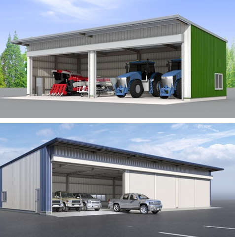 大型車両も格納できる本格鉄鋼造のガレージ型農業用倉庫。簡単な型番でご注文頂ける完全規格型の商品です。建築面積が113~420平方メートルの車庫をはじめとした農機具倉庫や作業場・資材倉庫などの用途に適しています。 建物の正面一箇所あたりの開口幅を最大8m確保しており、大型車両を納めるのにも十分な開口幅となっております。